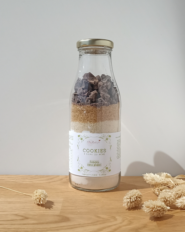 À ajouter à la préparation : œuf et beurre demi-sel. Toutes les instructions de préparation et les quantités d’ingrédients à ajouter figurent sur l’étiquette du produit. Les cookies se conservent une bonne semaine dans un contenant bien fermé.