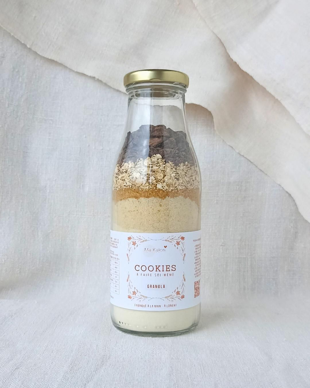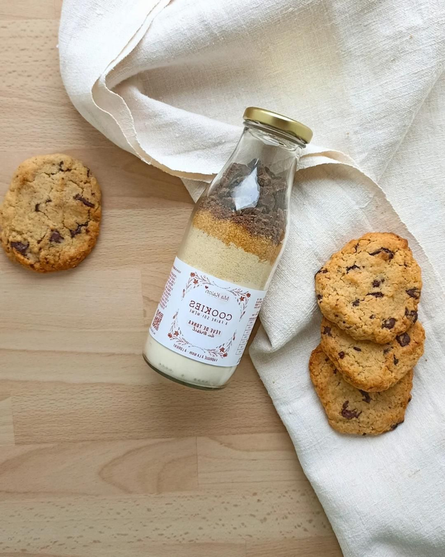 Préparation pour réaliser 8 à 10 cookies. Contenant au choix. Produit fabriqué à la main, avec des farines bretonnes et des morceaux de chocolat concassés manuellement.