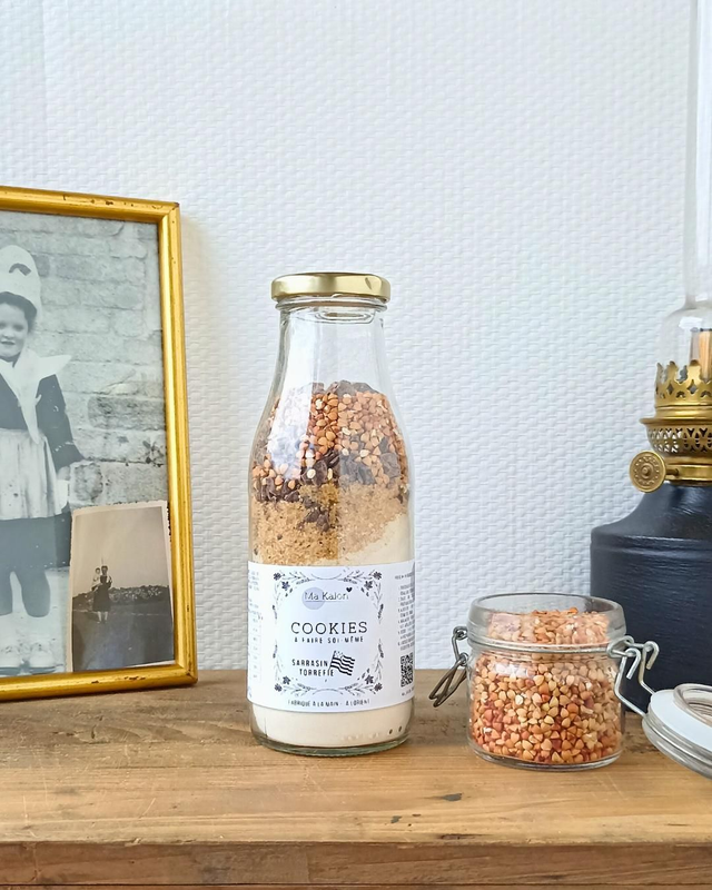 Préparation pour réaliser 8 à 10 cookies. Contenant au choix. Produit fabriqué à la main, avec des farines bretonnes et des morceaux de chocolat concassés manuellement.