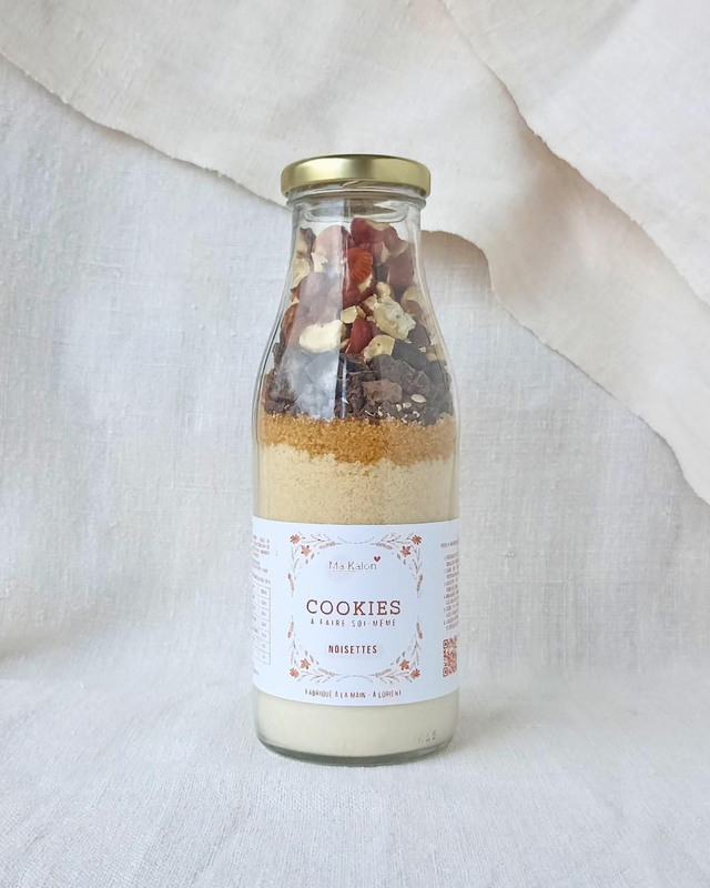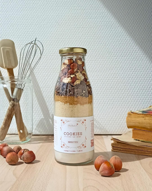 À ajouter à la préparation : œuf et beurre demi-sel. Toutes les instructions de préparation et les quantités d’ingrédients à ajouter figurent sur l’étiquette du produit. Les cookies se conservent une bonne semaine dans un contenant bien fermé.